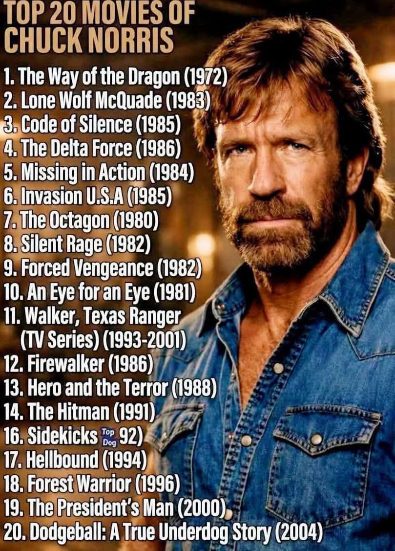 Carlos Ray "Chuck" Norris (March 10, 1940 – March 19, 2026) is an American martial artist, actor, screenwriter, and author. He holds a Black Belts in Karate, Taekwondo, Tang Soo Do, Brazilian jiu-jitsu, and Judo... After serving in the United States Air Force, Chuck won numerous martial arts championships and later founded his own discipline, Chun Kuk Do... Chuck Norris began working in the American film industry... as a martial arts instructor for celebrities... before making his screen debut with a minor role in... The Wrecking Crew (1968)... Friend and fellow martial artist Bruce Lee... invited him to play one of the main villains in... The Way of the Dragon (1972)... While Norris continued acting friend and student Steve McQueen... suggested he take it seriously! Norris took the starring role in the action film Breaker! Breaker! (1977), which turned a profit... His second lead... Good Guys Wear Black (1978), became a hit, and he soon became a popular action film star... |